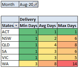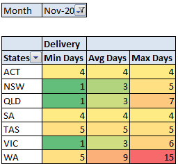 Snapshot of delivery time for recent months ~ where minimum delivery time of 0 day is Pickup and 1 day is via Express Post.