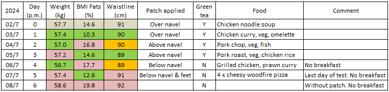 During the test, there was a slight weight reduction of 0.3 kg by Day 5. BMI fat percentages fluctuated, ranging from a low of 10.3% to a high of 17.7%, depending on my food intake the previous day. A significant change was that I did not have an urge for breakfast on Days 4, 5 and 6, which is unusual for me. Instead, I had an early lunch. Additionally, I felt decreased tightness in both fractured ankles from Day 4, which might be due to improved blood circulation.